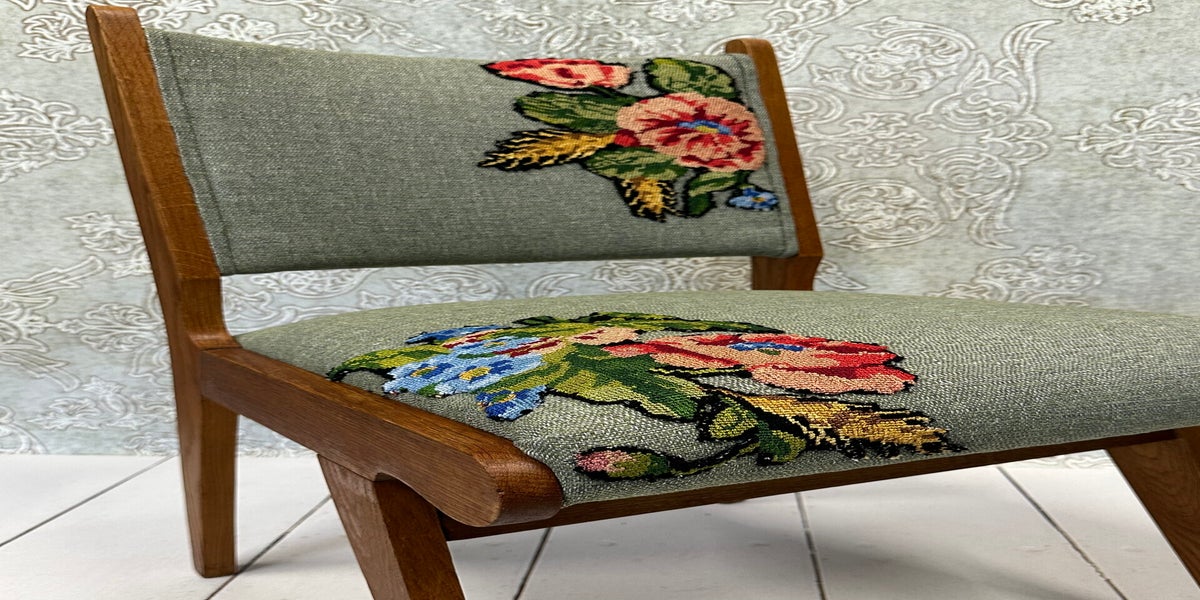 Stijlvol houten stoeltje met geborduurde bloem